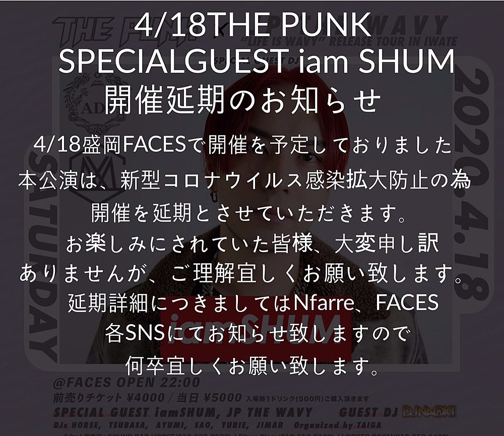 【コロナの影響で延期になりました】FACES 盛岡 イベントスケジュール 2020/04/18(土) 22:00 - FACES 盛岡 地図を表示 場所 : FACES 時間 22:00 SP GUEST : iamSHUM / JP THE WAVY FACES 盛岡 URLをコピーする 報告する