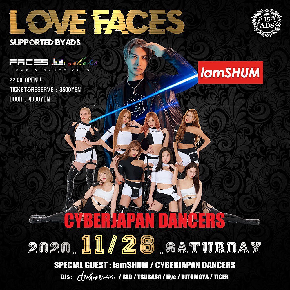 11月28日土曜日 ゲスト iamSHUM / CYBER JAPAN DANCERS 22:00 OPEN チケット 前売り¥3500 当日 ¥4000 詳細⬇️ 岩手県盛岡市大通り2-4-22 ニッカツゴールデンビル 3F faces_morioka@yahoo.co.jp Tel&Fax: 019-653-7606